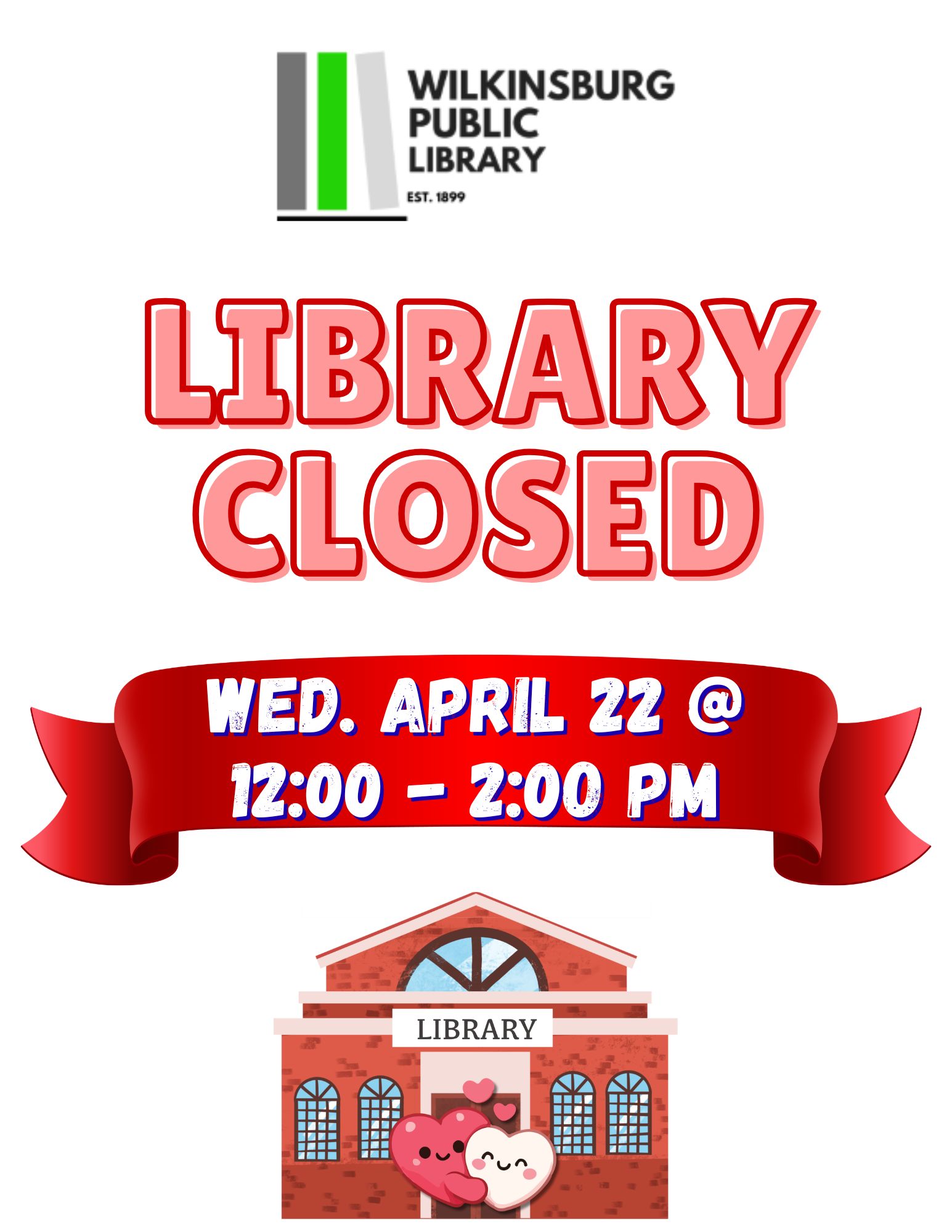 The Wilkinsburg Public Library will be CLOSED on Wednesday April 22 from 12:00 – 2:00 PM.